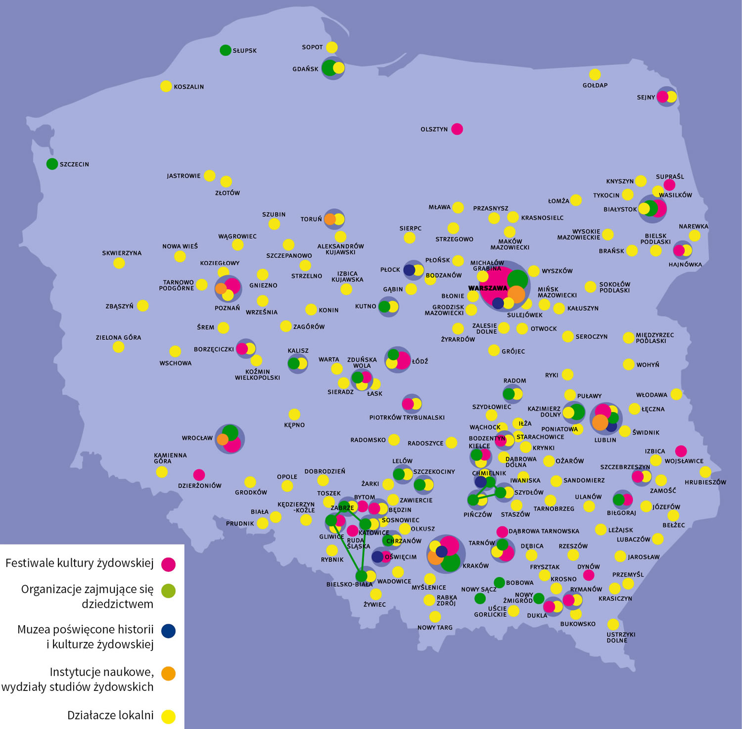 Trudno opisać ogrom inicjatyw, jakie wyrosły w ciągu ostatnich dwudziestu pięciu lat. Oddolne i odgórne, lokalne i centralne. W małych i dużych miastach. Festiwale, uczelnie, muzea, osoby prywatne. Mapa pokazuje ich wielość i różnorodność.